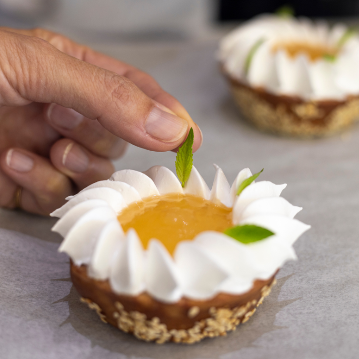 réalisation d’un biscuit, d’une crème onctueuse, travail des textures et dressage raffiné.